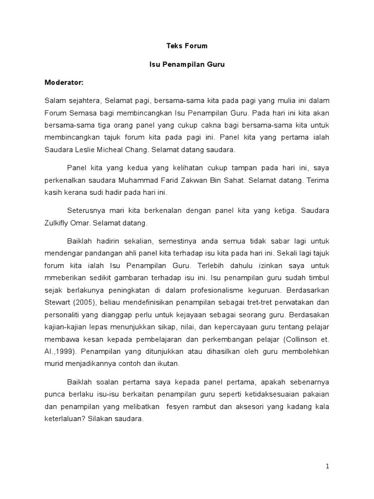 Contoh teks moderator berbeda dengan pembawa acara atau mc. Sebagai moderator izinkan saya untuk menyampaikan tata tertib pelaksanaan forum debat ini sebagai berikut. Teks forum teks forum memartabatkan bahasa melayu dalam mendepani arus kemodenan terima kasih saudari pengerusi forum rakan ahli panel dan course hero. Majlis ini kepada saudara mohd syahmi bin zamri selaku moderator forum "teladani akhlak rasulullah s.a.w." untuk memulakan forum. Teks moderator forum keibubapaan tajuk : Apakah peranan guru sebenarnya seiring dengan arus . Forum script for mc that can be use as reference if needed for assignment or any presentation. Moderator merupakan seseorang yang dibutuhkan dalam segala bentuk forum, baik itu rapat, sidang, seminar, presentasi ataupun beberapa . Untuk mengetahuinya, simak apa saja tugas moderator serta contoh teksnya! Script given is with the theme of internet tajuk forum .